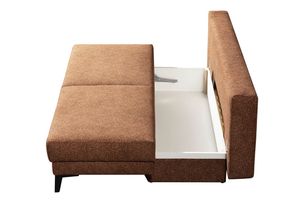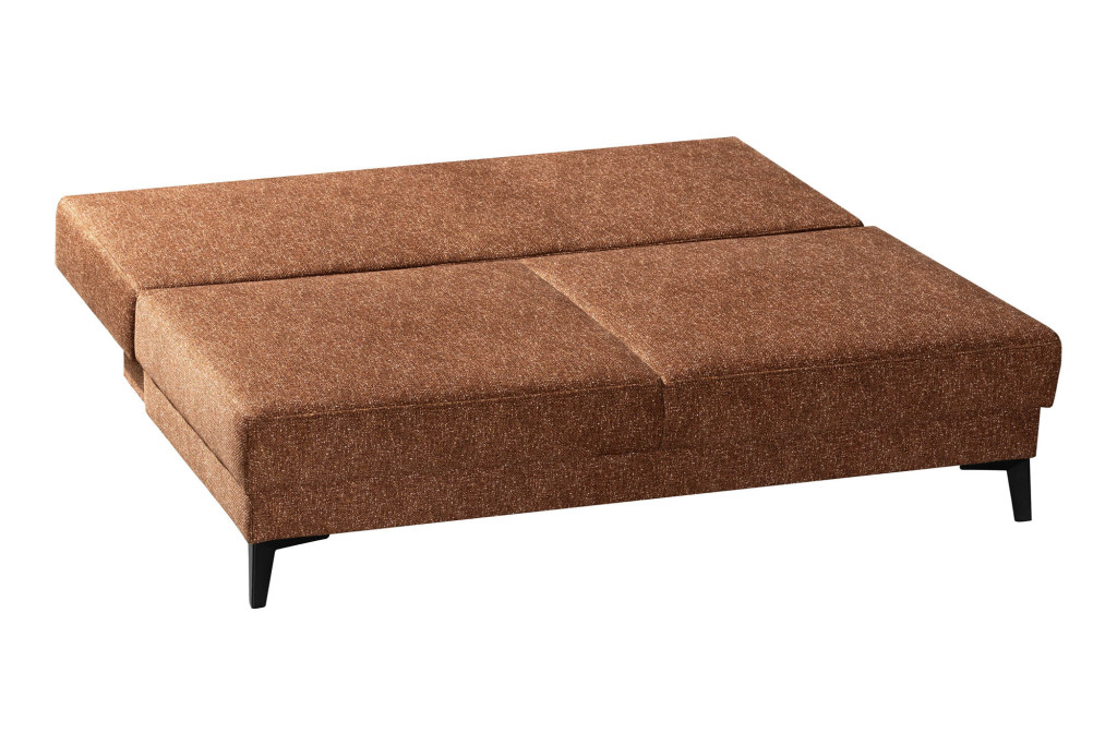Flachgewebe, 100% Polyester, Farbe terra, Sitz Federkern, Rücken echt bezogen, inklusive geräumigen Bettkasten, Fuß Metall schwarz, Sitzhöhe 48 cm, Liegehöhe 48 cm, Liegefläche 155 x 200 cm, BHT ca. 204/93/100 cm