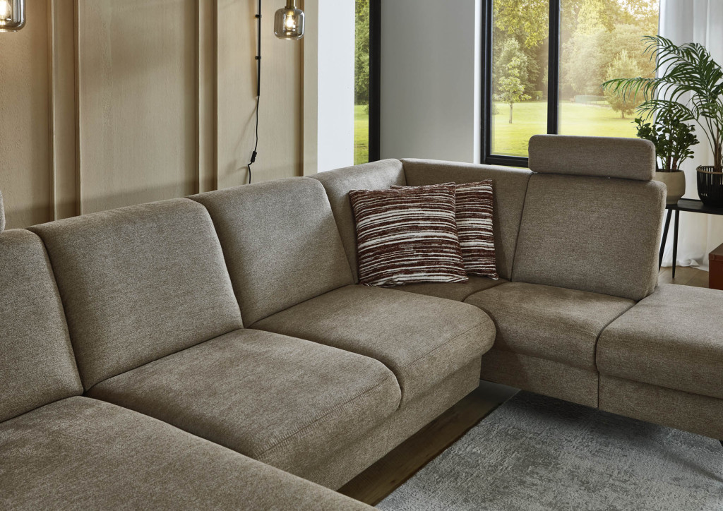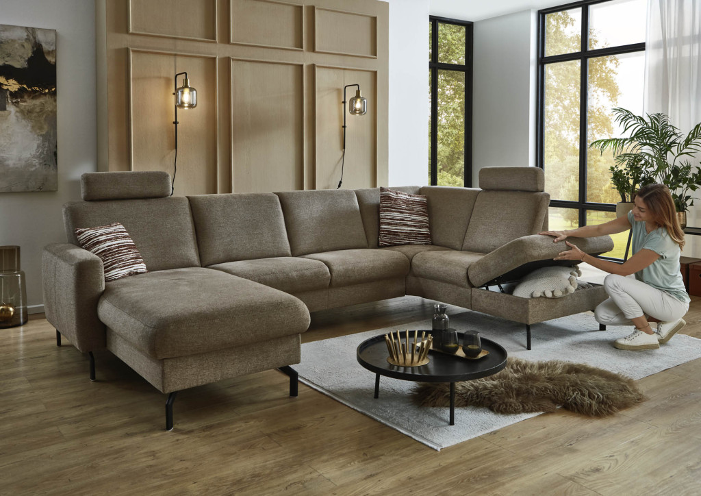 Erleben Sie höchsten Sitzkomfort mit der eleganten Polstergarnitur. Der hochwertige Stoff in der Farbvariante Mandel verleiht Ihrem Wohnraum eine warme, zeitlose Ausstrahlung. Die sorgfältig gearbeitete Doppelsteppnaht ohne Kontrast sorgt für ein harmonisches Gesamtbild, während der Kaltschaum-Sitz optimalen Komfort und Langlebigkeit garantiert. Schwarze Metallfüße setzen moderne Akzente und verleihen der Garnitur eine filigrane Leichtigkeit. Mit ihrer großzügigen Ecklösung und dem unechten Rücken bietet die perfekte Kombination aus Stil, Qualität und Funktionalität – ein Möbelstück, das zum Entspannen und Verweilen einlädt.