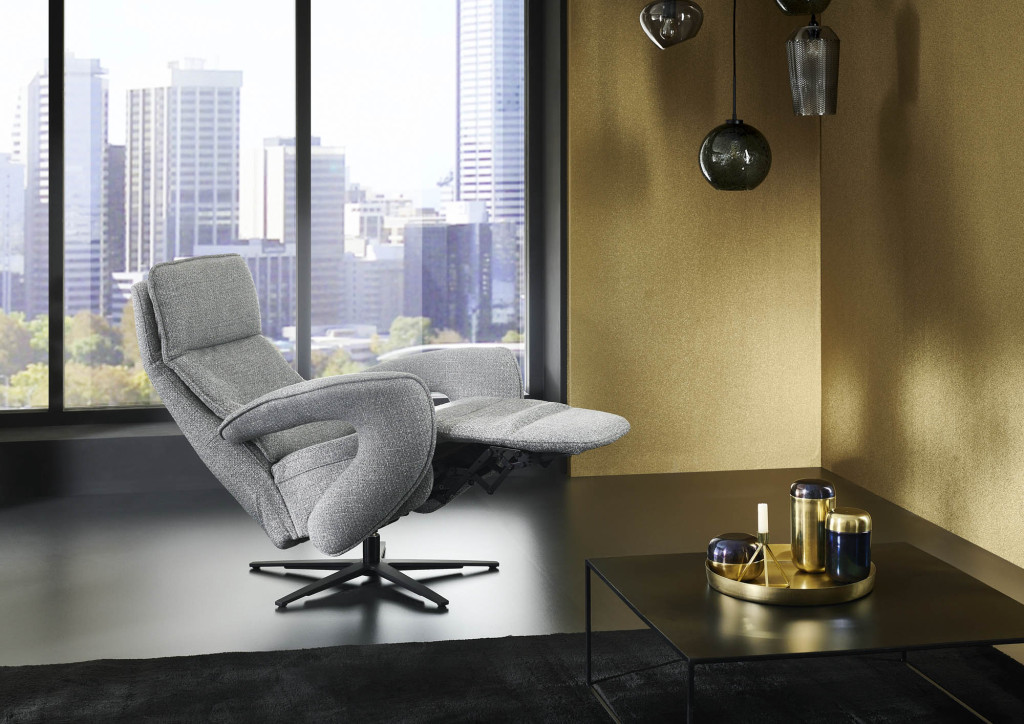 Flock, Nutzschicht 100 % Polyamid, Grundschicht 60 % Polyester, 40 % Acryl, Farbe dream grey, Metallfuß sternförmig pulverbeschichtet schwarz, Sitzhöhe 45 cm, Sitztiefe 52 cm, Verstellung der Beinauflage und Rückenlehne durch Körperdruck, manuelle Kopfpolsterverstellung, BHT ca. 75/110/87-175 cm