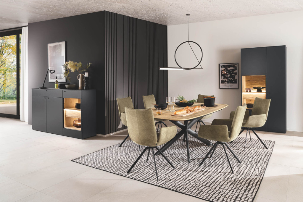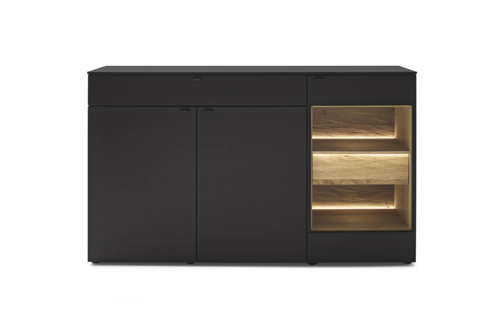 Entdecken Sie das vielseitige Sideboard, das sich perfekt in Ihr Zuhause einfügt. Mit einem großen Typenplan bietet es Ihnen unzählige Gestaltungsmöglichkeiten, um Ihren individuellen Stil zu unterstreichen. Wählen Sie ein Untergestell, das Ihre Einrichtung harmonisch ergänzt und setzen Sie mit Akzentfronten und -rückwänden in gehackter Eiche stilvolle Highlights. Optional sorgt eine integrierte Beleuchtung für eine stimmungsvolle Atmosphäre und rückt Ihre Lieblingsstücke ins rechte Licht. Dieses Sideboard verbindet elegantes Design mit hoher Funktionalität und wird schnell zum Mittelpunkt Ihres Wohnraums. Lassen Sie sich von der hochwertigen Verarbeitung und den vielfältigen Optionen begeistern und verleihen Sie Ihrem Zuhause eine persönliche Note.