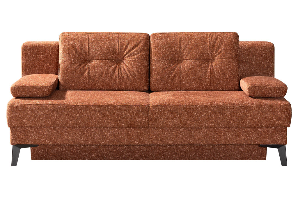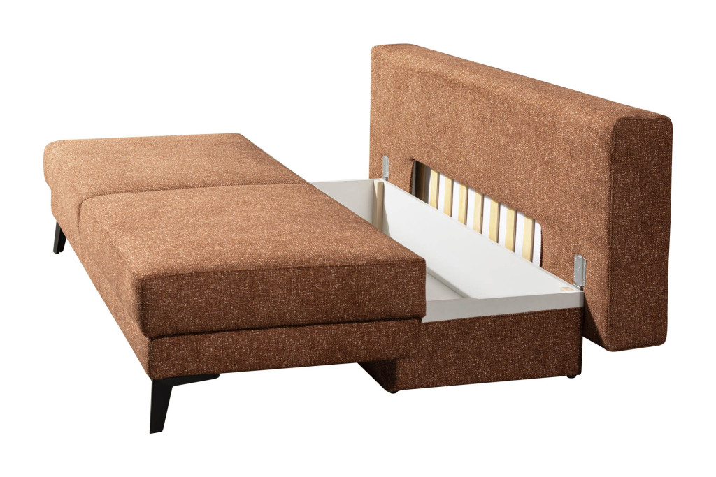 Flachgewebe, 100% Polyester, Farbe terra, Sitz Federkern, Rücken echt bezogen, inklusive geräumigen Bettkasten, Fuß Metall schwarz, Sitzhöhe 48 cm, Liegehöhe 48 cm, Liegefläche 155 x 200 cm, BHT ca. 204/93/100 cm