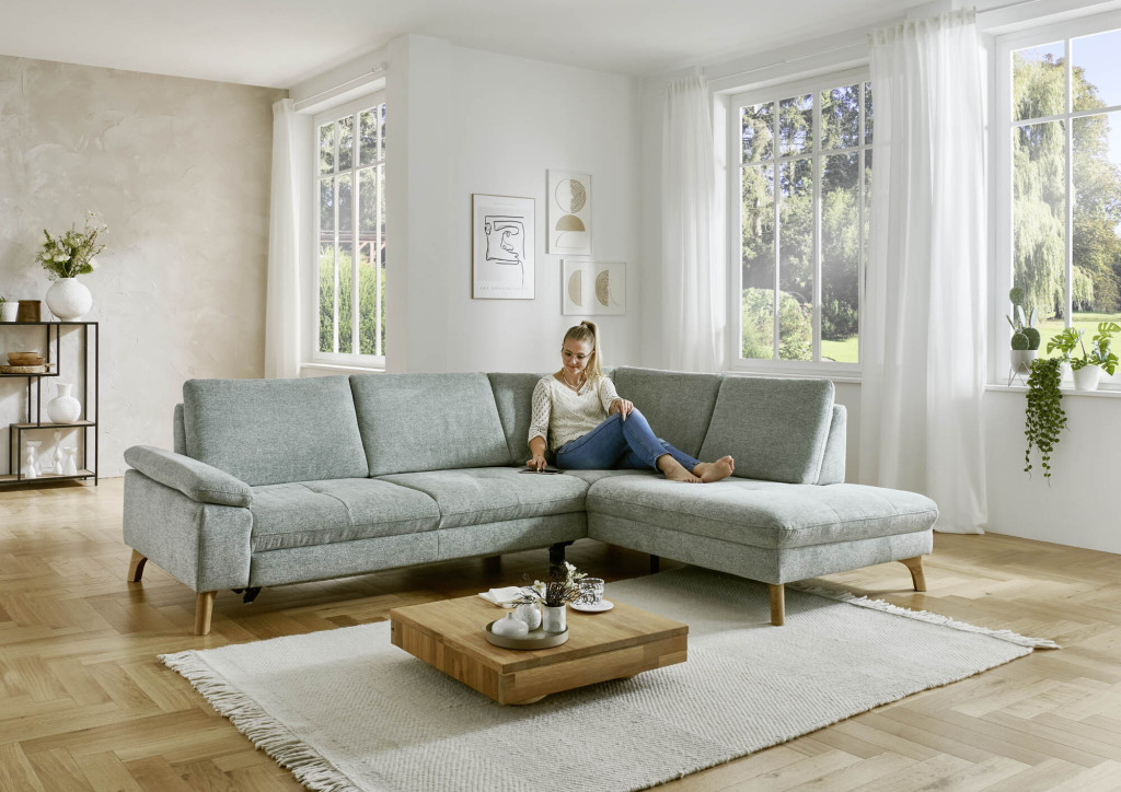 Flachgewebe, 100 % recyceltes Polyester, Rücken echt, Sitz Federkern, Holzfuß Wildeiche, Sitzhöhe 45 cm, Sitztiefe 68 cm, bestehend aus: 3-Sitzer, Armlehne links, BHT ca. 182/87/105 cm, 1-Sitzer Kombielement, BHT ca. 100/87/220 cm, Stellmaß ca. 282x220 cm