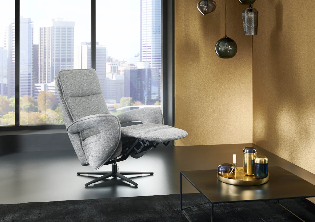 Flock, Nutzschicht 100 % Polyamid, Grundschicht 60 % Polyester, 40 % Acryl, Farbe dream grey, Metallfuß sternförmig pulverbeschichtet schwarz, Sitzhöhe 45 cm, Sitztiefe 52 cm, Verstellung der Beinauflage und Rückenlehne durch Körperdruck, manuelle Kopfpolsterverstellung, BHT ca. 75/110/87-175 cm